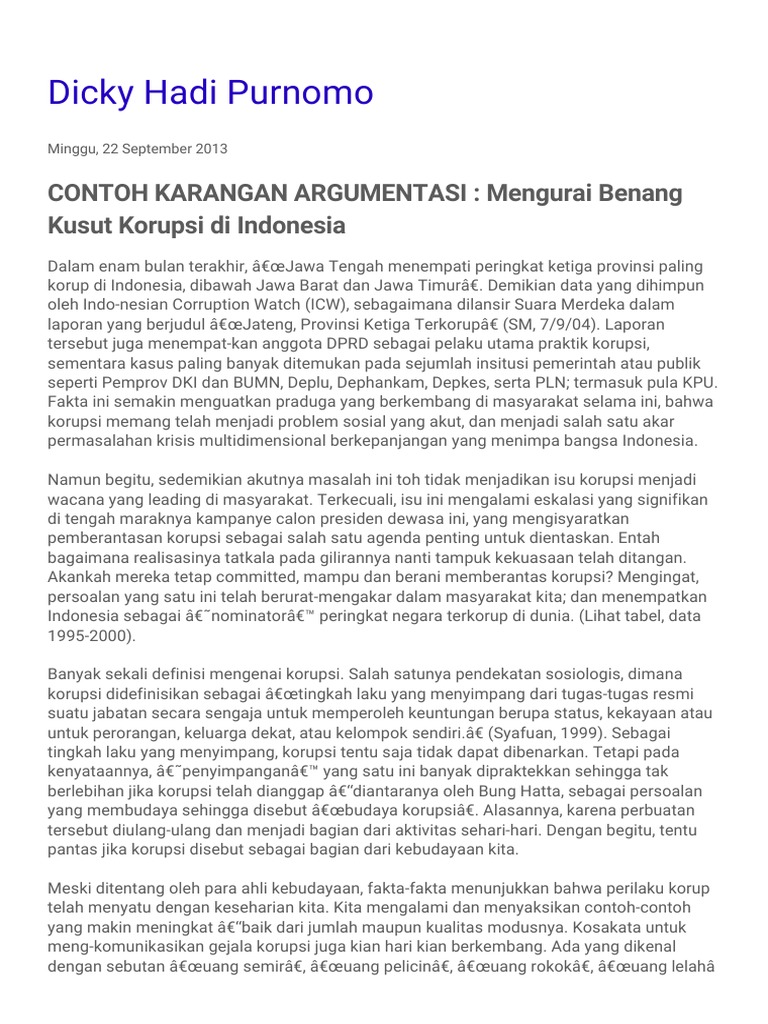 Dicky Hadi Purnomo Contoh Karangan Argumentasi Mengurai Benang Kusut Korupsi Di Indonesia