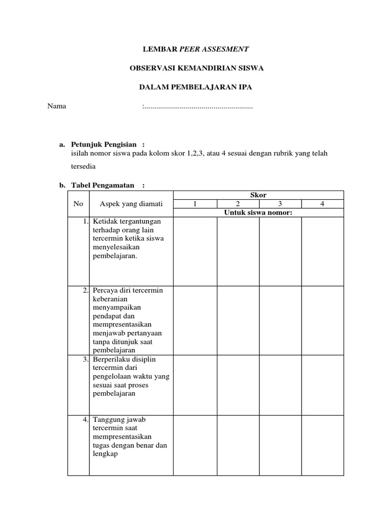 Contoh Instrumen Observasi Dalam Penilaian Formatif