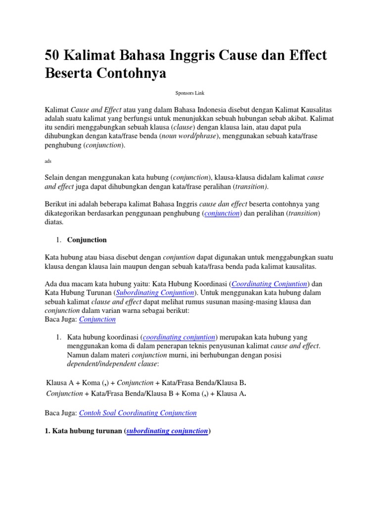 50 Kalimat Bahasa Inggris Cause Dan Effect Beserta Contohnya Docx