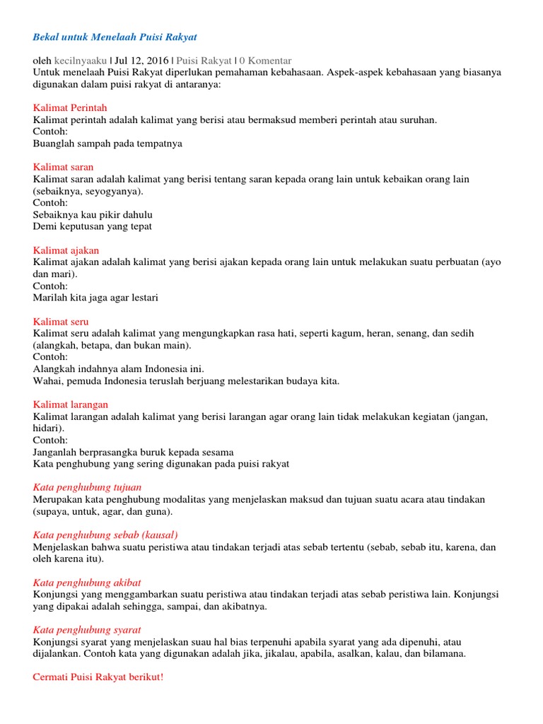 Buatlah Kalimat Dalam Sebuah Larik Puisi Rakyat Dengan Ketentuan A Kalimat Perintahb Kalimat Brainly Co Id
