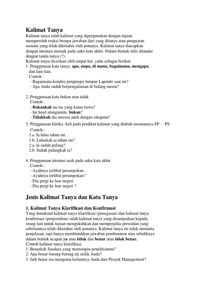 Kalimat Tanya Contoh Kalimat Tanya Dengan Jawaban Ya Tidak Jenis Kalimat Tanya 1 Kalimat Tanya Pdf Document